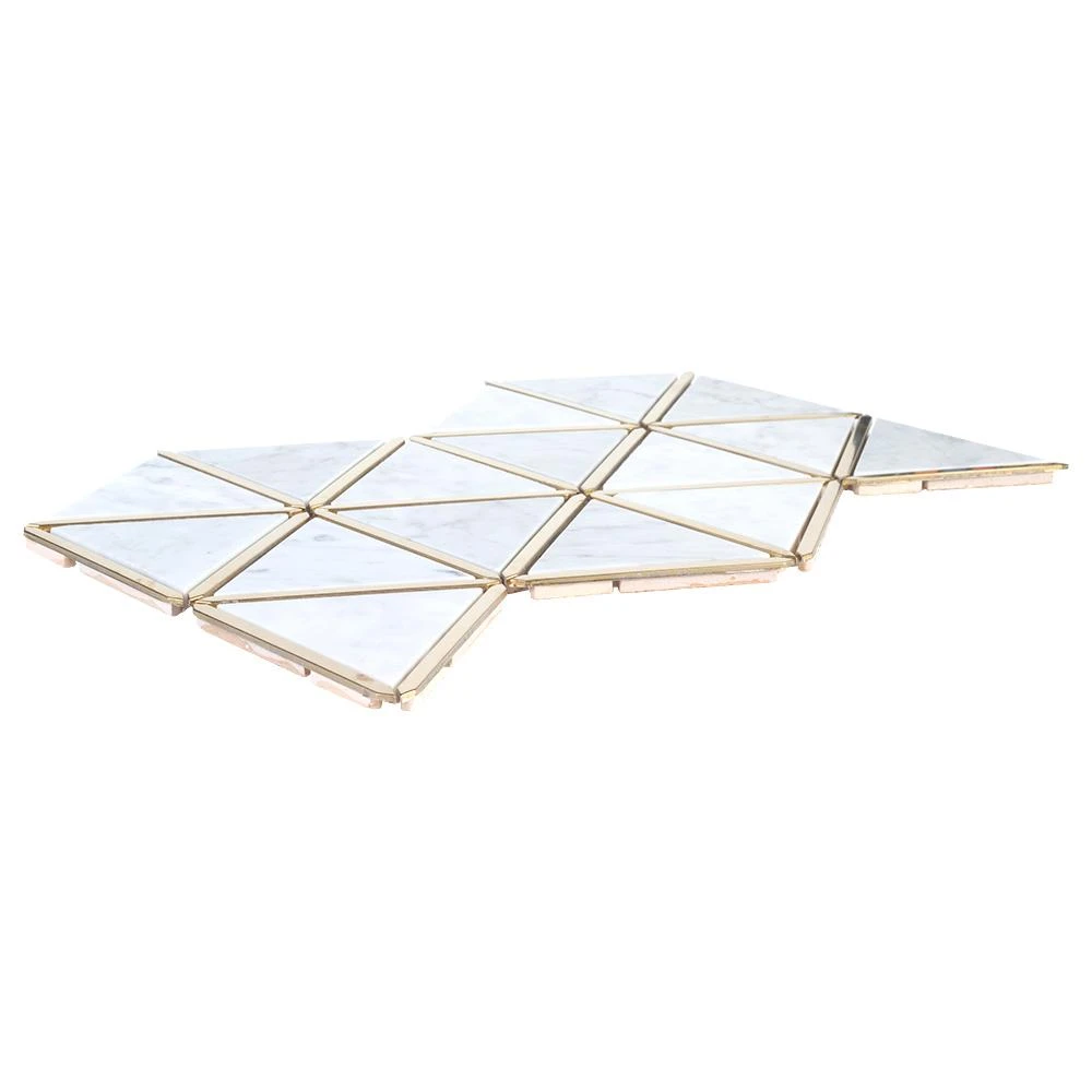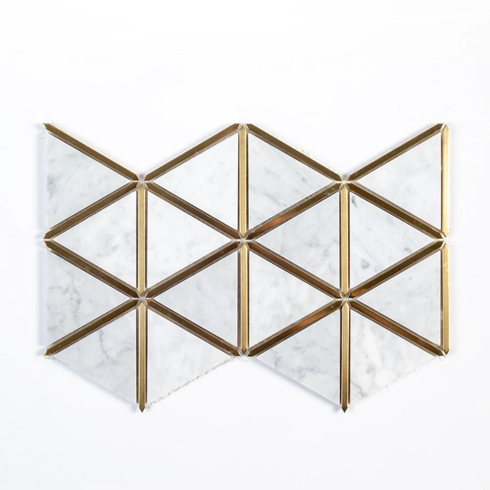 From the Jeff Lewis Tile collection, Larchmont 8-1/2 in. x 14-1/2 in. is a beautifully crafted large format mosaic tile that feature interlocking geometric triangles for a modern and contemporary look. Contained in brushed gold metal accents, grey mineral veins swirl and streak randomly throughout the natural white marble stone for a timeless addition to any home.